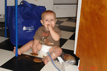 Garrison had discovered a bag of oatmeal cookies unattended on a table at his height. He helped himself into the bag, pulled out three cookies, and was working his way through them.