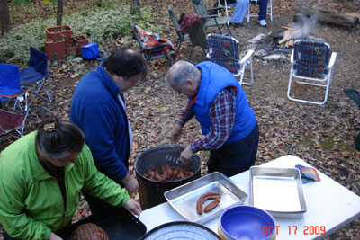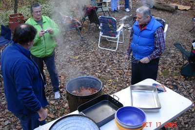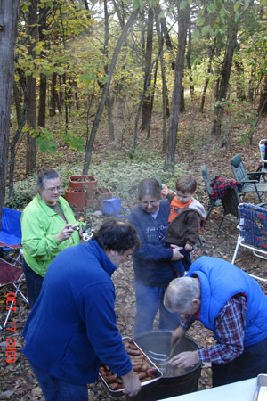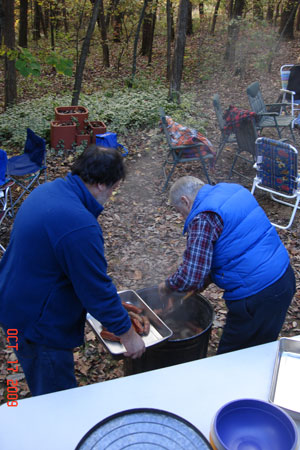 For those of you who are wondering the trashcan cookout is an idea we got from a family that Grumpy works with after we went to theirs a while back. Wayne and Marilyn have been helping us ever since we said--hey we want to do that! Lisa G. (soon to be F.) probably described it the best when she said "think clam bake". So that's basically it, a bunch of food stuffed in a huge steel trashcan and steamed for 5 or so hours. Corn on the bottom with cabbages, red potatoes, carrots and onions layered then topped with a variety of sausages and hams. YUMMY! It all stays on top of a camp fire and makes the yard smell so good.