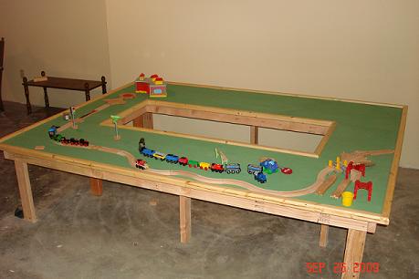 And he does, behold the nearly 48 square feet of train wonderment that is taking up an entire corner of the nearly finished basement!