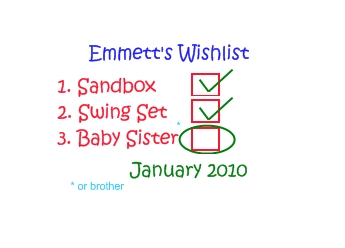 Well, Emmett's list is almost finished! Emmett's baby sister (or brother, although he's not as receptive to that idea) is set to arrive on January 26, 2010.