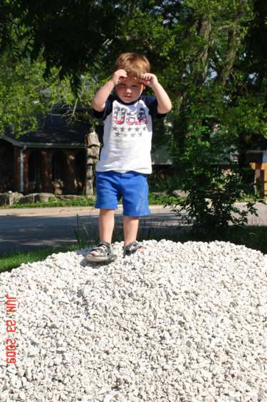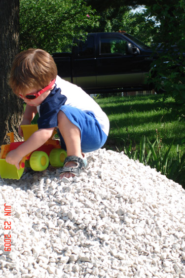 Chris has been working very hard to create a patio outside the former GIANT HOLE in the basement wall (it was only an open access to the house for about 36 hours one weekend). Now that he finally finished the retaining wall to keep the mountain of dirt from flowing back in through the door like the old leaky picture window we got 8.5 tons of gravel delivered today. Emmett was excited when the giant dump truck arrived in the driveway to dump it's load. He stood in the garage and watched as the pile was created. I asked if he wanted to play in it, but he said it was too hot outside.