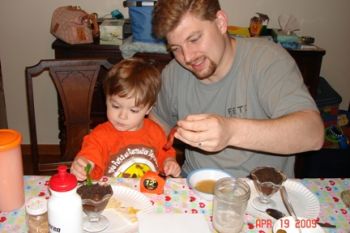 We also played some games like the Egg-'n-Spoon Relay game...Emmett only dropped the egg once! And as a prize, he got to eat a Peanut Butter Cup treat!