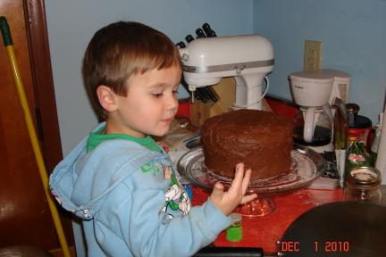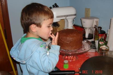 Emmett helped make a triple-decker chocolate cake; he was in charge of batter and quality control.