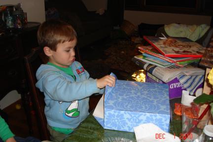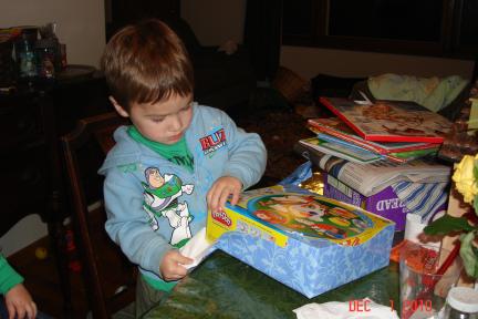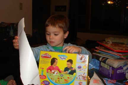 After dinner we gave him our presents. Below is Emmett opening a puppy play-doh factory. It's a really neat set!