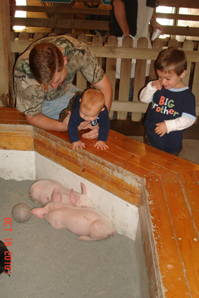 Garrison like leaning over the ledge to pet the different animals in the petting area. In this pen there were 2 piglets and a chicken. Emmett told, "momma, I'm too scared of that chicken to pet him."