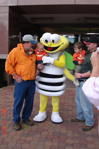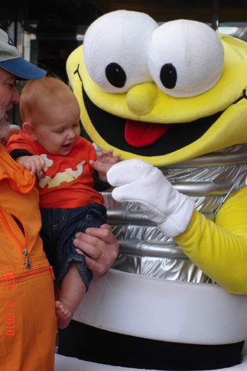 Every two years, (or from what I can tell, this is how often it occurs) Ameren holds a family day all about safety in conjunction with weveral area businesses. The WHOLE family was in attendance. Since Grandpa works for Ameren and and Grandma were there and we took Omi and Grumpy with us. Grumpy got his picture taken with the boys and Louie the CFL. Garrison was not at all afraid of the giant costumed character, in fact from the pictures you can see how much he enjoyed it.
